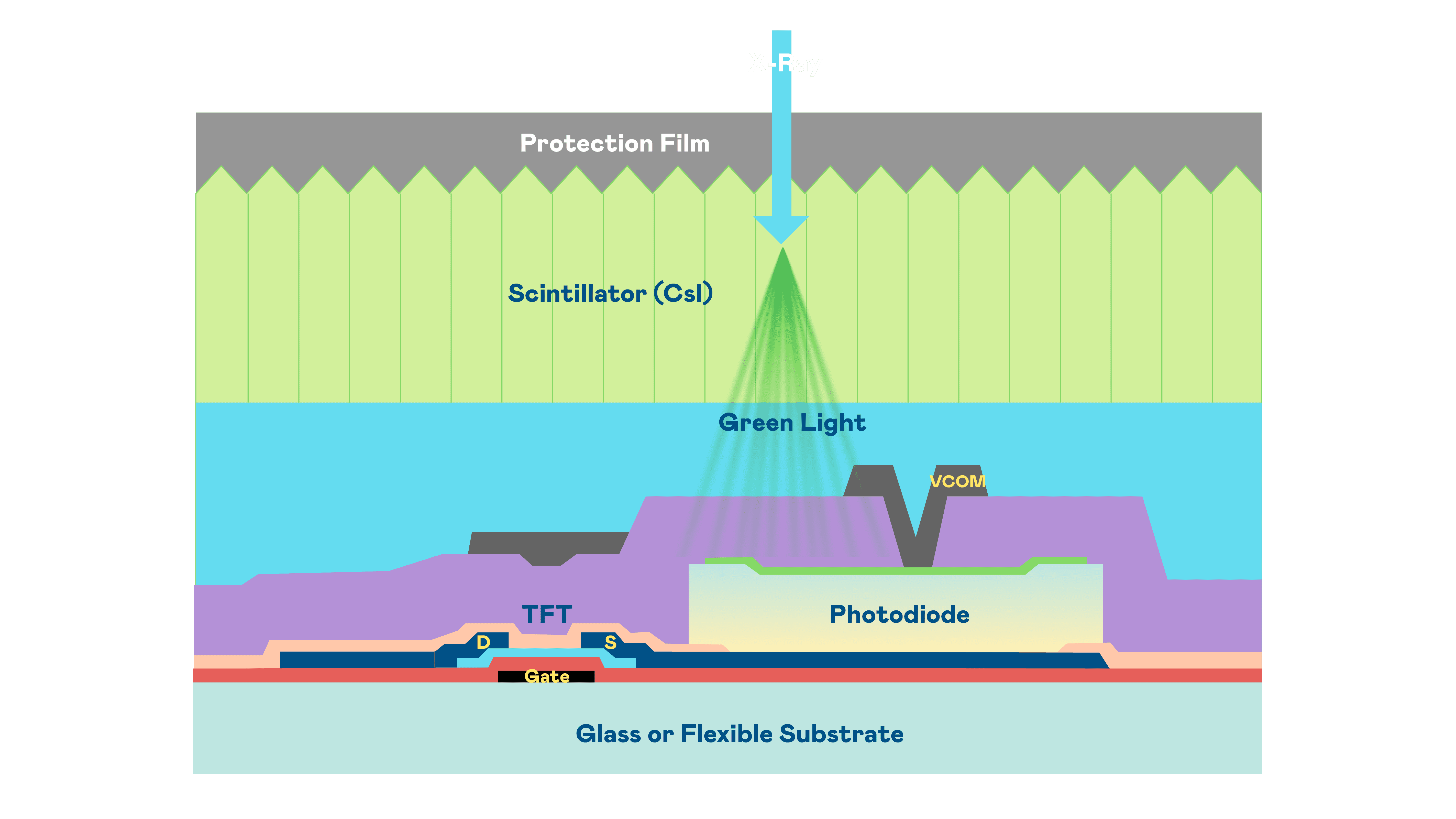 财神娱乐的X光影像感测阵列使用薄膜电晶体 (TFT) 作为每个像素的读取开关,,,搭配光电二极体(Photodiode)的光电转换元件,,,,用以感测X光影像讯号。。。。